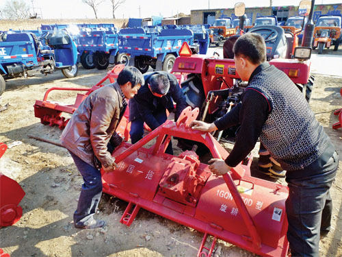 七九河開(kāi),八九燕來(lái)。春耕生產(chǎn)開(kāi)始之際,農(nóng)民們開(kāi)始為春耕做準(zhǔn)備。圖為原平市大陽(yáng)村村民王師傅正在購(gòu)買(mǎi)農(nóng)機(jī)。(李玉生 攝)