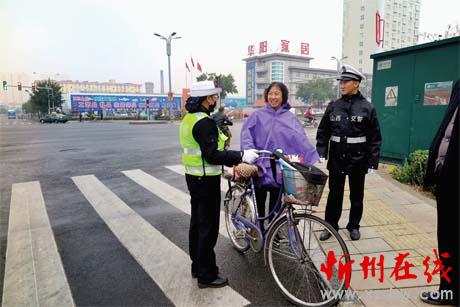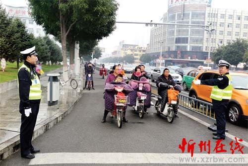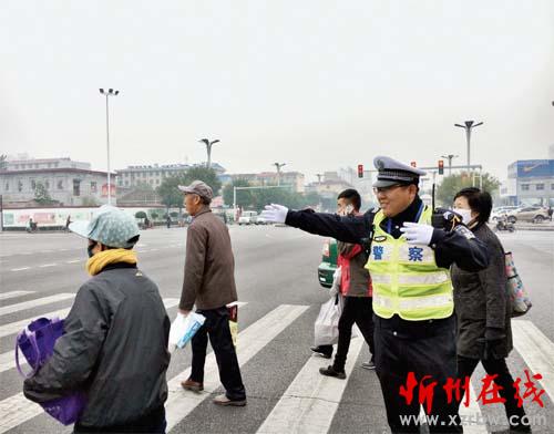 圖四:10 月15 日,交警在七一路與利民街十字路口引導行人過馬路