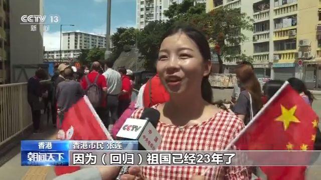 在花車巡游途中,還可以看到有大批民眾在道路兩旁,手持國(guó)旗和特區(qū)區(qū)旗,熱烈慶祝香港回歸祖國(guó)23周年。