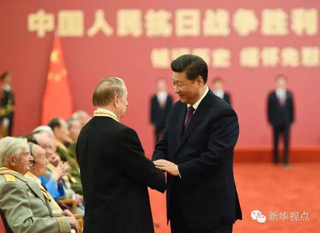 2015年9月2日,習(xí)近平在北京人民大會(huì)堂向30名抗戰(zhàn)老戰(zhàn)士老同志、抗戰(zhàn)將領(lǐng)、幫助和支持中國抗戰(zhàn)的國際友人或其遺屬代表頒發(fā)中國人民抗日戰(zhàn)爭勝利70周年紀(jì)念章并發(fā)表重要講話。新華社記者 謝環(huán)馳攝