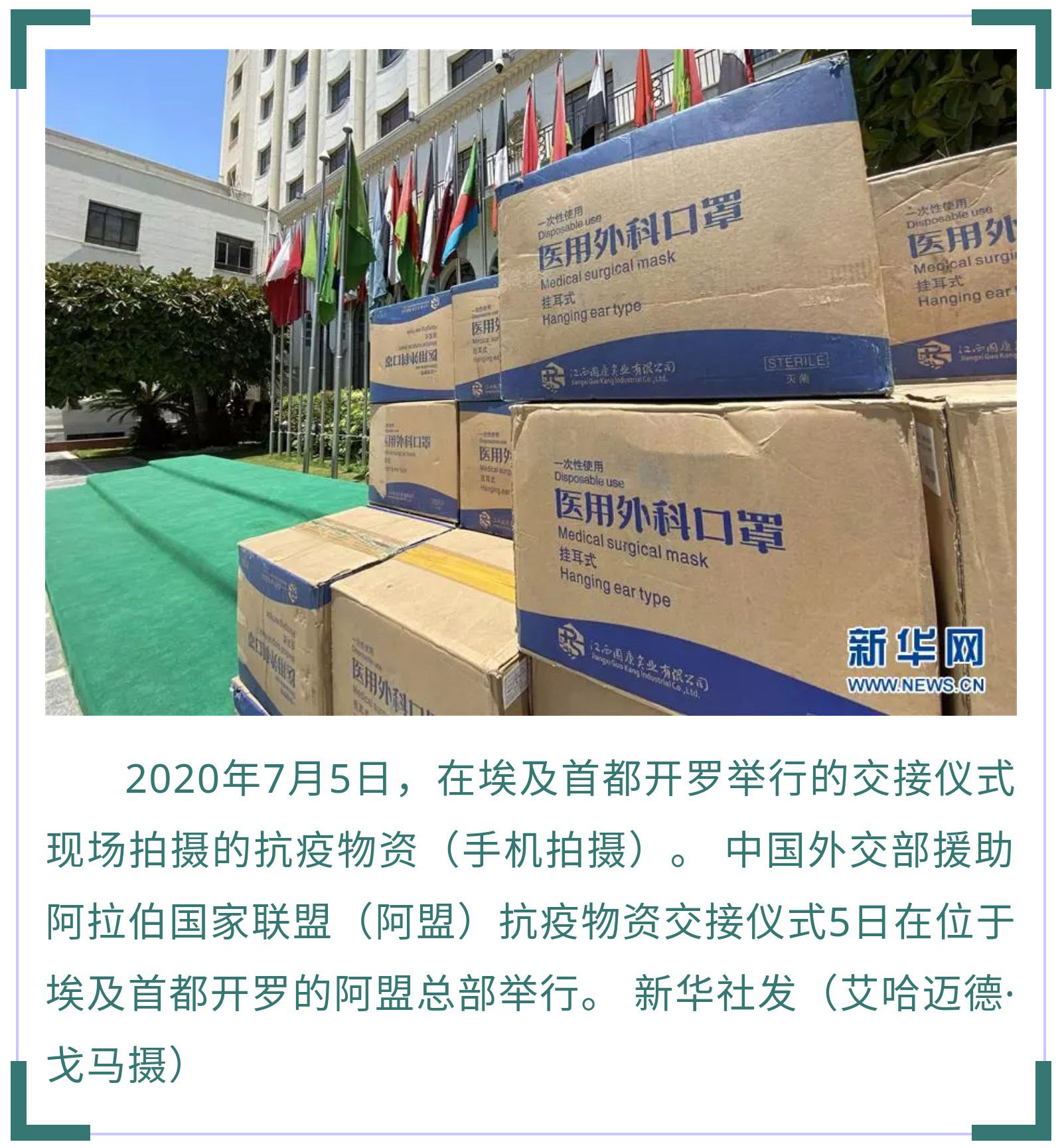 7月5日,中國外交部援助阿盟抗疫物資交接儀式在開羅舉行。中國駐埃及大使廖力強(qiáng)代表中國外交部向阿盟副秘書長胡薩姆·扎基移交了防護(hù)口罩。據(jù)廖力強(qiáng)介紹,新冠疫情暴發(fā)以來,中方向阿拉伯國家援助了大量物資,毫無保留地向阿拉伯國家分享抗疫經(jīng)驗(yàn)和技術(shù),同21個阿拉伯國家舉辦了衛(wèi)生專家視頻會議,向8個阿拉伯國家派遣了醫(yī)療組,同時協(xié)助阿拉伯國家在中國采購抗疫物資,支持阿拉伯國家有序復(fù)工復(fù)產(chǎn)。