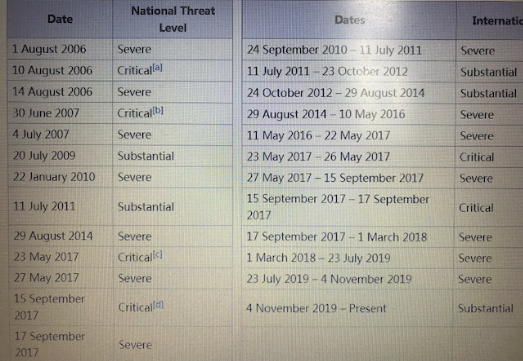 2005年,英國(guó)發(fā)生了震驚中外的倫敦地鐵恐襲爆炸案,共造成56人死亡(包括4名恐怖分子)。2006年8月1日起,英國(guó)警方開(kāi)始公開(kāi)發(fā)布國(guó)家安全風(fēng)險(xiǎn)預(yù)警,從低到高,一共有5個(gè)等級(jí)。