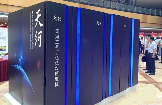 △2019年7月6日,“紀(jì)念中國(guó)超級(jí)計(jì)算事業(yè)發(fā)展四十年暨國(guó)家超級(jí)計(jì)算天津中心成立十周年”活動(dòng)在天津?yàn)I海新區(qū)舉行。這是活動(dòng)現(xiàn)場(chǎng)展示的“天河三號(hào)”百億億次原型機(jī)。