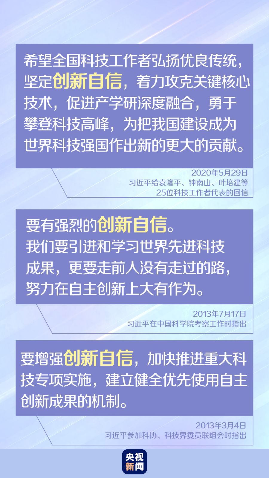 科技興則民族興,科技強(qiáng)則國(guó)家強(qiáng)——重溫歷史,幾多感慨,幾多壯志。自力更生是中華民族自立于世界民族之林的奮斗基點(diǎn),自主創(chuàng)新是我們攀登世界科技高峰的必由之路,創(chuàng)新自信讓我們?cè)谕ㄍ磥?lái)的道路上行穩(wěn)致遠(yuǎn)。自力更生,自主創(chuàng)新——以習(xí)近平同志為核心的黨中央帶領(lǐng)中國(guó)向著建設(shè)世界科技強(qiáng)國(guó)的宏偉目標(biāo)奮勇前進(jìn)。