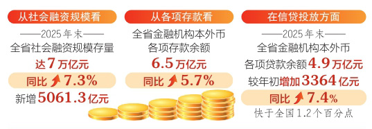 從社會(huì)融資規(guī)???,2025年末,全省社會(huì)融資規(guī)模存量達(dá)7萬億元,同比增長7.3%;新增5061.3億元。其中,投向?qū)嶓w經(jīng)濟(jì)的本外幣貸款和政府債券凈融資增量合計(jì)占全部社融增量的94.4%。