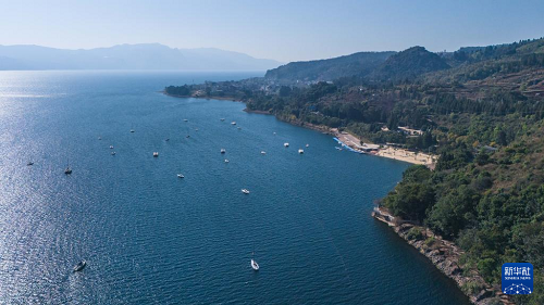 1月27日在云南省玉溪市拍攝的撫仙湖一景(無(wú)人機(jī)照片)。(新華社記者 高詠薇 攝)
