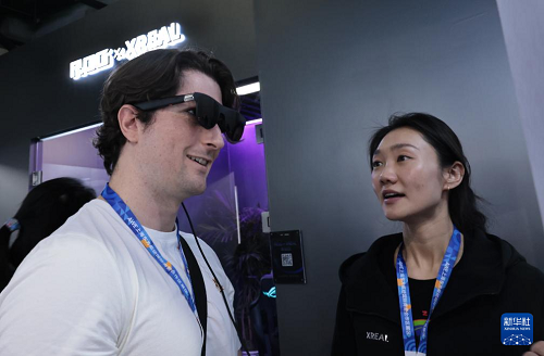 3月12日,參觀者(左)在東方樞紐展區(qū)現(xiàn)場體驗一款智能眼鏡產(chǎn)品。(新華社記者 方喆 攝)