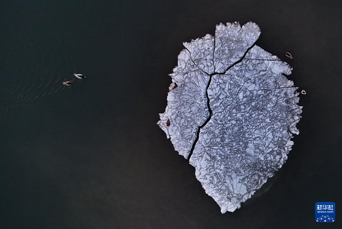3月22日,候鳥在松花江哈爾濱城區(qū)江面休息(無人機(jī)照片)。(新華社發(fā) 張樹 攝)
