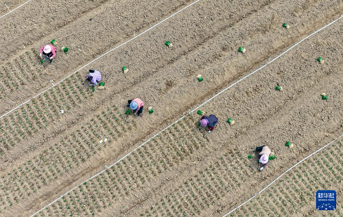 3月24日,廣西南寧市邕寧區(qū)蒲廟鎮(zhèn)農(nóng)民在田園里種植蔬菜(無(wú)人機(jī)照片)。(新華社發(fā) 方永濤 攝)