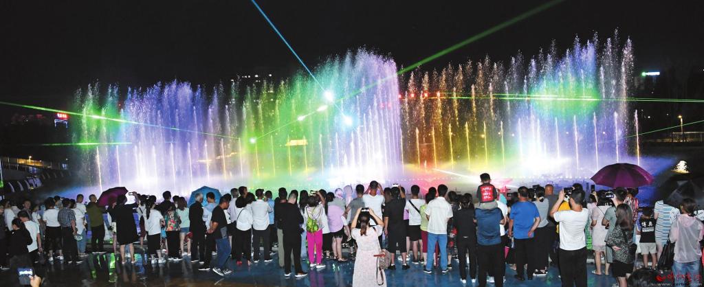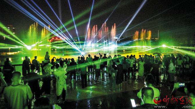 公園在注重園林、景觀建設(shè)的同時(shí),突出主題文化內(nèi)涵的展現(xiàn),湖水噴泉、觀賞果園、主題植物園、階梯花臺(tái)等特色園林具有觀賞性,園內(nèi)還配套建有遺山文化館、張拉膜廣場、健舞劇場、休閑茶吧、咖啡館等群眾休閑活動(dòng)場所,是又一惠及民生的心靈家園。圖為8月1日晚,市民在遺山公園噴泉廣場觀賞絢麗多彩的噴泉燈光秀。劉紀(jì)森 智芝龍 白曉明 胡 煒 攝