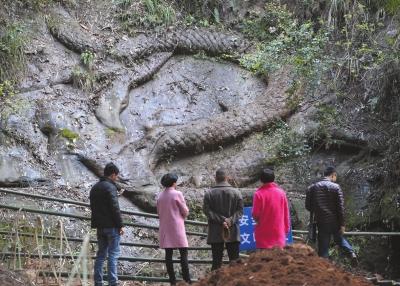 石龍雕刻位于石龍村的石龍溝,在山溝里的一處半山腰上。昨天下午,記者趕到現(xiàn)場(chǎng)時(shí),多名當(dāng)?shù)厝苏谑埾路蕉哑鍪^,準(zhǔn)備做成堡坎,防止石龍周圍再被泥土及滑坡掩埋。