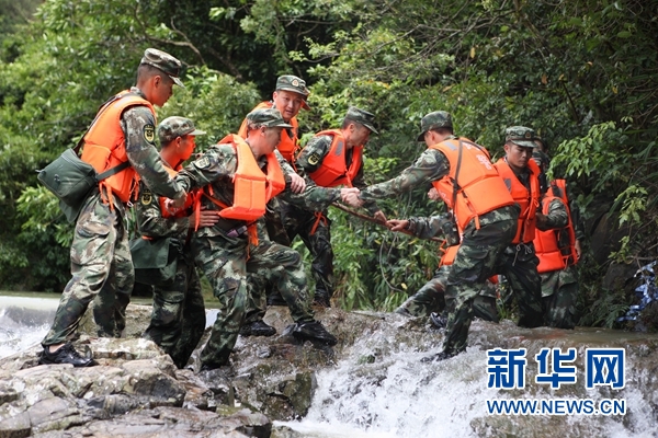 5月29日,武警官兵在事發(fā)河段附近搜救失蹤人員。當(dāng)日,廣東省江門市所轄臺山市人民政府披露,28日發(fā)生的臺山市端芬鎮(zhèn)鳳凰峽旅游區(qū)游客漂流遇山洪落水事故中,死亡人數(shù)升至8人,其中7人身份已經(jīng)確定。新華社發(fā)(王東震 攝)