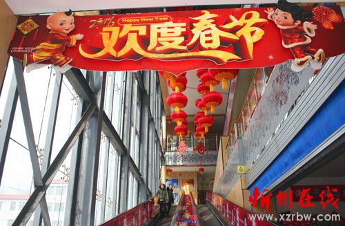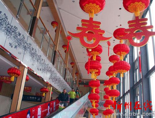 年味越來越濃,1月23日原平市商場里張燈結(jié)彩,大紅燈籠高高掛,一派喜慶景像,市民們在打扮一新的商場里,在喜慶氣氛中夠年貨迎新春。(趙月仁 攝)