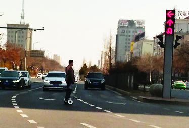 忻州小伙“騎輪”過馬路
