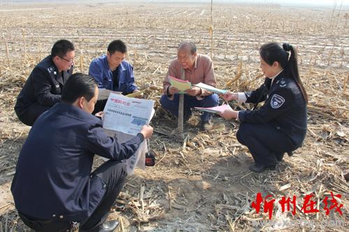怎樣把《中華人民共和國大氣污染防治法》和《五臺縣人民政府嚴防森林火災的通告》宣傳到人?五臺縣環(huán)境保護局、環(huán)境監(jiān)察大隊分組劃片,組織環(huán)保人員深入到田間地頭,面對面讀報給農(nóng)民聽,手遞手散傳單讓農(nóng)民看,為農(nóng)民解釋燒秸稈、燒地堰、燒荒等野外違規(guī)用火行為的危害。臺城鎮(zhèn)西關(guān)村66歲的農(nóng)民張存在就高興地對縣環(huán)境監(jiān)察人員說:“你們這樣解釋,咱懂,“地頭環(huán)?!痹坜r(nóng)民也記得牢,我家4畝地的秸稈保證不燒一根,咱漚糞去,多打糧,又不污染。”圖為地頭宣傳環(huán)境保護,增強農(nóng)民環(huán)保意識。(金俊賢 攝)
