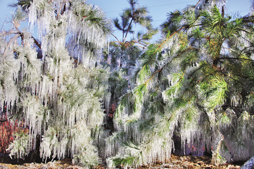 3月26日早晨,原平市交通公園的各種風(fēng)景樹木驚現(xiàn)樹掛冰凌奇觀,蔚為壯觀,吸引了市民前來觀賞。據(jù)了解,該樹掛冰凌是公園工作人員對各種花草樹木進行春澆噴灌時,由于早晨溫度較低,噴灌的霧狀水滴集結(jié)而成,到上午太陽光照下,此奇觀已經(jīng)消失。(吉建平 攝)