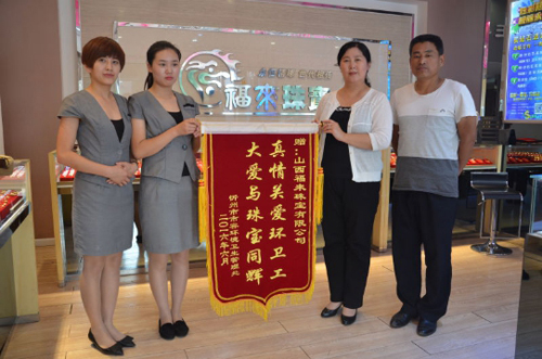 環(huán)衛(wèi)處副處長張林霞代表環(huán)衛(wèi)處向福來珠寶回贈錦旗以示感謝