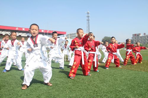 7月17日,孩子們?cè)谠绞修r(nóng)校活動(dòng)中心練習(xí)跆拳道。暑假期間,該市許多青少年投入到另一種學(xué)習(xí)狀態(tài),選擇學(xué)習(xí)跆拳道、舞蹈、書法、美術(shù)、音樂等,感受精彩的藝術(shù)世界,豐富暑假生活。(褚震 攝)