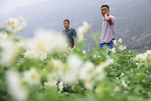 8月13日,原平市紅池村民正在土豆地里查看長(zhǎng)勢(shì),兩人看著喜人的土豆開(kāi)心的笑了。原平市山區(qū)農(nóng)民根據(jù)土地土壤結(jié)構(gòu)松散的特點(diǎn),以種植土豆為主要農(nóng)作物,不分地塊大小,也不論坡地還是平地,長(zhǎng)出的土豆個(gè)頭大好吃,既可以當(dāng)主食食用,也可以制作為蔬菜,一食多用,是餐桌上的香餑餑,銷(xiāo)售價(jià)格節(jié)節(jié)攀升,是山區(qū)百姓脫貧致富的金圪蛋。(吉建平 攝)