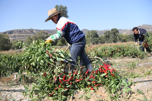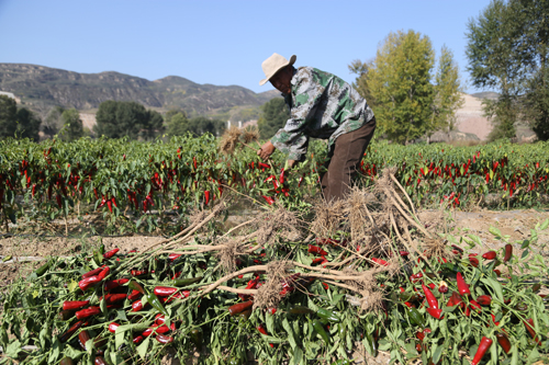 10月8日,靜樂縣永倉種植專業(yè)合作社萬畝辣椒種植示范園中10300畝辣椒喜獲豐收。近年來,該縣調(diào)整產(chǎn)業(yè)結(jié)構(gòu),大力發(fā)展無公害辣椒種植,引進種植新品種韓國紅辣椒。該合作社今年連片訂單栽植的10300 畝辣椒目前長勢良好,預計平均畝產(chǎn)6000 斤,最高可達一萬斤。今年又是一個豐產(chǎn)年,大伙的生活就像紅辣椒一樣過得紅紅火火。圖為合作社工人在收獲辣椒。(閆曉梅 攝)