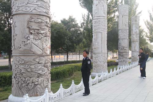 10月9日,原平市民在范亭文體廣場(chǎng)聚落的柱式雕塑前觀看愛國名將續(xù)范亭、東晉名士郝隆等16位名人紀(jì)念雕像。近年來,該市著力打造文化強(qiáng)市,利用柱式雕塑像繪制歷史文化名人、抗日英雄等群體形象,營造濃濃的文化氛圍。(褚震 攝)
