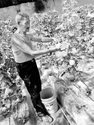 4月11日,忻府區(qū)部落村金山農(nóng)業(yè)示范園區(qū),68歲的村民馮永安在自己的大棚內(nèi)采摘香瓜。七年前,他敢嘗敢試開始種植大棚香瓜,每到這個(gè)香瓜上市的季節(jié),他和老伴吃住在大棚,精心待弄這些寶貝疙瘩,光這一畝大棚香瓜,每年都可以給他帶來十萬元左右的收入。尤其是近兩年,他自創(chuàng)科學(xué)方法,改良連種土壤,使香瓜的品質(zhì)、產(chǎn)量都保持穩(wěn)定勢(shì)頭,深受市場(chǎng)歡迎。他不僅帶動(dòng)本村村民共同致富,而且為慕名而來的同行熱心傳授技術(shù),成為遠(yuǎn)近聞名的大棚香瓜種植專家。本報(bào)記者 聶艷英 攝