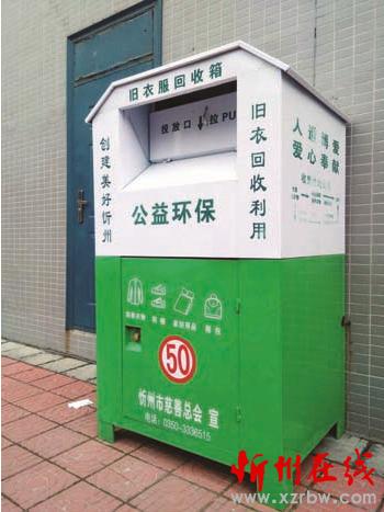 市慈善總會工作人員表示,下一步市慈善總會將與志愿者組織聯(lián)合制作更多的舊衣服回收箱,投放覆蓋忻州城區(qū)所有小區(qū),使我市的慈善捐助工作機制逐步走向常態(tài)化。圖為設(shè)置在惠民小區(qū)的舊衣物回收箱(魯明強)