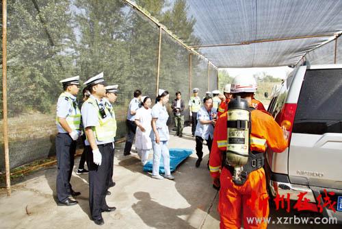 演練假設(shè)當(dāng)日上午10時(shí)10分在S206南屯隧道入口處,一輛小型汽車(chē)與一輛?;愤\(yùn)輸車(chē)追尾,此次交通事故造成兩人死亡、1人受傷,汽油泄露,隨時(shí)有爆炸的危險(xiǎn)……110指揮中心接到群眾報(bào)警后,立即下達(dá)事故救援指令,并通知“120”醫(yī)療急救中心、“119”消防大隊(duì),同時(shí)將事故情況向交警大隊(duì)進(jìn)行了匯報(bào),請(qǐng)示該市道路交通安全委員會(huì)啟動(dòng)重特大交通事故應(yīng)急救援預(yù)案。民警趕赴事故現(xiàn)場(chǎng)后,各項(xiàng)救援工作有條不紊進(jìn)行?,F(xiàn)場(chǎng)救援組立即展開(kāi)受傷人員救護(hù)等工作,協(xié)助醫(yī)療隊(duì)伍做好傷員救治及傷員轉(zhuǎn)送工作;現(xiàn)場(chǎng)勘查組著手開(kāi)展了現(xiàn)場(chǎng)勘查、調(diào)查取證等工作;外圍警戒組對(duì)現(xiàn)場(chǎng)中心路段進(jìn)行交通管制,在不同路段堵截分流無(wú)關(guān)車(chē)輛、人員;善后處理組拖移事故車(chē)輛、移送尸體、對(duì)事故現(xiàn)場(chǎng)進(jìn)行了清理。