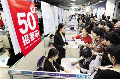 23日上午11點(diǎn),重慶市江北區(qū)觀音橋一家人才招聘市場(chǎng)內(nèi),一個(gè)掛著“五十萬(wàn)招兼職”海報(bào)的招聘展位前人頭攢動(dòng)。排隊(duì)等候填表報(bào)名的人將兩米寬的過(guò)道塞得滿滿當(dāng)當(dāng)。