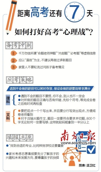 高考進(jìn)入最后倒計(jì)時(shí),沖刺階段如何提分?高考改革后,大學(xué)、中學(xué)、師生等應(yīng)如何應(yīng)對(duì)?27日,華南師范大學(xué)人才測(cè)評(píng)與考試研究所所長(zhǎng)張敏強(qiáng)做客廣東職工大講堂第二十四場(chǎng),講解“高考改革應(yīng)對(duì)策略與高三沖刺應(yīng)對(duì)措施”。 張敏強(qiáng)提醒,沖刺階段切勿盲目相信網(wǎng)上所謂的“內(nèi)部題”“必考題”,應(yīng)以“溫故”為主,不建議再做過多新題目。他提醒家長(zhǎng),考慮志愿填報(bào)要充分了解孩子的興趣和未來發(fā)展方向,要尊重孩子的抉擇,“找到合適的專業(yè),比純粹挑學(xué)校還要重要?!?/p> ●南方日?qǐng)?bào)記者 畢嘉琪 黃應(yīng)來 實(shí)習(xí)生 黃靜儀 通訊員 姚文軍 談改革 用全國(guó)卷對(duì)錄取沒有影響 高考既是學(xué)生的人生大考,也是對(duì)社會(huì)管理的大考驗(yàn)。張敏強(qiáng)透露,今年全國(guó)高考報(bào)名考生約970萬人,“粗略估算,考生的父母、祖輩近7000萬人,加上超過100萬的監(jiān)考人員及其他工作人員,與高考相關(guān)的人數(shù)接近一億人。”由此,高考的公平性和科學(xué)性歷來受到高度關(guān)注。 張敏強(qiáng)梳理了從1977年恢復(fù)高考以來,我國(guó)高考改革的歷程。他提煉了2014年國(guó)家發(fā)布的高考改革方案中的多項(xiàng)重大變化:一是高考不再分文理科;二是西部高校為中西部學(xué)子留專門名額,部屬高校嚴(yán)控屬地招生比例;三是高考加分項(xiàng)目“瘦身”;四是重點(diǎn)高校定向招收貧困生;五是高中學(xué)業(yè)水平考試一年兩考,覆蓋所有科目避免偏科。 而從今年起,高校自主招生已逐步嚴(yán)控規(guī)模,并安排在高考后進(jìn)行;中學(xué)也將逐步建立學(xué)生綜合素質(zhì)檔案,供高校錄取參考。 著眼廣東,今年高考也有一項(xiàng)重大變化——回歸全國(guó)卷。“我認(rèn)為,今年使用全國(guó)卷對(duì)廣東來說是好的。國(guó)家命題,出卷老師和考試大綱是長(zhǎng)期穩(wěn)定的,全國(guó)的師資條件及水平,對(duì)比省級(jí)有優(yōu)勢(shì);而省級(jí)自主命題,受人員及其他條件的影響,科目之間難度起伏比較大,”張敏強(qiáng)說。 有不少學(xué)生家長(zhǎng)擔(dān)心,相比廣東卷,今年的全國(guó)卷會(huì)難度增加,甚至?xí)绊戜浫 埫魪?qiáng)回應(yīng)稱,國(guó)家命題與省命題對(duì)錄取沒有影響,而高考實(shí)際上是“常模參照考試”,錄取按照從高分到低分的順序進(jìn)行?!爸袊?guó)的高考是按省定名額、劃分?jǐn)?shù)線的,所以,無論是國(guó)考、省考,錄取總額是不變的,錄取關(guān)注的是排名的位置。” 談?dòng)绊?“3+3”組合將影響專業(yè)錄取 根據(jù)廣東省人民政府頒發(fā)《關(guān)于深化考試招生制度改革的實(shí)施意見》(以下簡(jiǎn)稱“實(shí)施意見”),廣東的考試招生制度單項(xiàng)改革從2016年陸續(xù)展開,2018年啟動(dòng)高考綜合改革,2021年高考實(shí)行新的高考綜合改革方案。那么,未來廣東的高考將如何實(shí)施? “我省高考將統(tǒng)一實(shí)行‘3+3’的考試模式?!睆埫魪?qiáng)解析,未來廣東本科院校招生不分文理科設(shè)置考試科目,實(shí)行語文、數(shù)學(xué)、外語3門統(tǒng)一高考科目和3門高中學(xué)業(yè)水平考試科目考試方式,即“大3+小3”。 其中,外語、學(xué)業(yè)水平考試實(shí)現(xiàn)“一年兩考”;語文、數(shù)學(xué)、外語每科滿分150分。而3門高中學(xué)業(yè)水平考試科目由考生根據(jù)所報(bào)考高校的要求和自身特長(zhǎng),在思想政治、歷史、地理、物理、化學(xué)、生物等科目中自主選擇。 高考方式的改革無疑給中學(xué)、大學(xué)的教學(xué)管理乃至每個(gè)家庭的抉擇帶來不小的挑戰(zhàn)。張敏強(qiáng)指出,在“大3+小3”的新高考模式下,思想政治、歷史、地理、物理、化學(xué)、生物6科,學(xué)生選擇3科,所以共有20種組合。學(xué)生和老師會(huì)出現(xiàn)“走班”或者“走教”的情況?!斑@就要求,中學(xué)要根據(jù)學(xué)生的需求和大學(xué)專業(yè)的錄取科目合理設(shè)置課程;大學(xué)作為考生的接收單位,也需要根據(jù)考生報(bào)考情況設(shè)置不同的錄取分?jǐn)?shù)線以及調(diào)整專業(yè)設(shè)置?!?/p> 此外,由于選什么樣的科目組合將影響學(xué)生高考報(bào)考的專業(yè),因此要求中學(xué)老師不僅要教學(xué)育人,專業(yè)出色,還得肩負(fù)學(xué)生職業(yè)生涯的指導(dǎo)工作,要根據(jù)學(xué)生興趣、能力特點(diǎn)指導(dǎo)選科、報(bào)考志愿。 “家長(zhǎng)也必須對(duì)孩子的興趣、特點(diǎn)要有更深入的了解?!庇纱怂ㄗh在場(chǎng)的家長(zhǎng)們,高考結(jié)束后,要主動(dòng)與孩子深入溝通,充分了解他們的興趣、職業(yè)規(guī)劃后再填報(bào)志愿。 談應(yīng)考 家長(zhǎng)勿輪流過問孩子 距離高考不足10天,張敏強(qiáng)認(rèn)為,此時(shí)探究學(xué)習(xí)方法、學(xué)習(xí)新知識(shí)已不現(xiàn)實(shí),也難以在短時(shí)間有明顯成效,關(guān)鍵是要做好考前心理調(diào)適以及掌握應(yīng)考技巧。張敏強(qiáng)不建議考生做新的題目,而是要把之前做過的題目鞏固記憶。他提醒考生,千萬勿信所謂的“命題老師押題”等虛假信息,“命題人員的