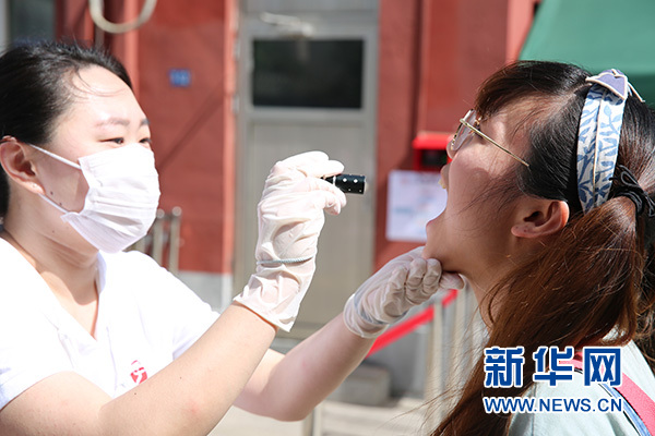 幼兒園保健醫(yī)生對“孩子”做進一步晨檢。