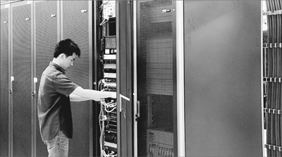 在東南亞電信(柬埔寨)有限公司建設的云數據中心里,工作人員正在調試設備。本報記者 張志文攝