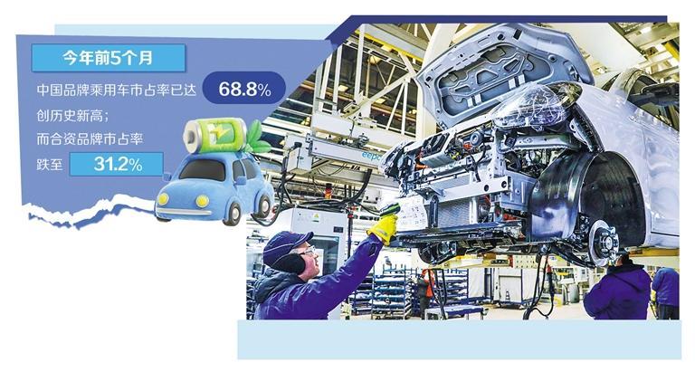 電動化與智能化變革浪潮,不僅在加速汽車產(chǎn)品進(jìn)化,也在深刻重構(gòu)市場競爭格局。中汽協(xié)數(shù)據(jù)顯示,今年前5個月,中國品牌乘用車市占率已達(dá)68.8%,創(chuàng)歷史新高;而合資品牌市占率跌至31.2%,創(chuàng)出新低。