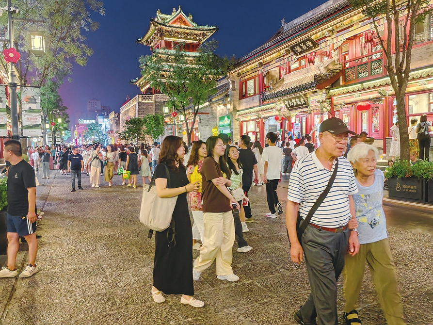 8月2日,入夜后的太原市鐘樓街燈火璀璨、熱鬧非凡,市民們來此散步休閑、購物娛樂,體驗多元消費業(yè)態(tài)。