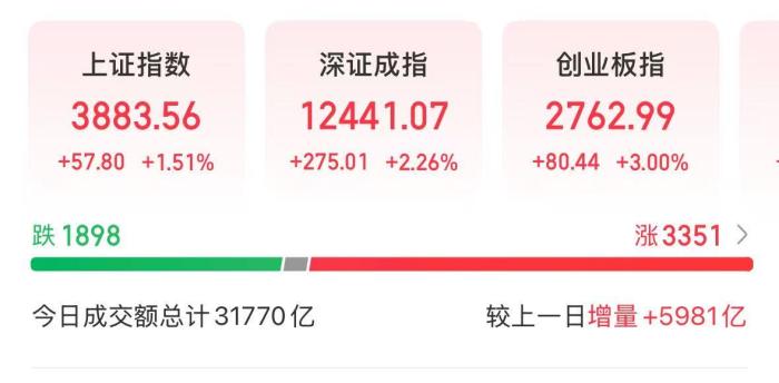 截至收盤,滬指漲1.51%報3883.56點,深成指漲2.26%報12441.07點,創(chuàng)業(yè)板指漲3%報2762.99點。滬深京三市全天成交額31770億元,較前一交易日大幅放量。
