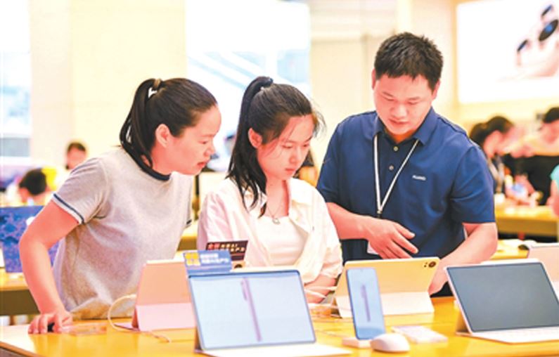 在江西省宜春市袁州區(qū)潤達國際購物中心的電子數(shù)碼產(chǎn)品專營店內(nèi),工作人員向消費者介紹平板電腦產(chǎn)品。