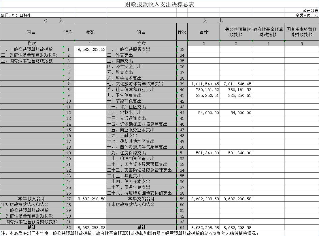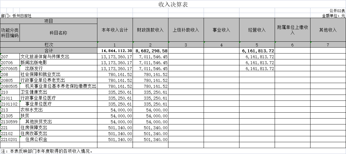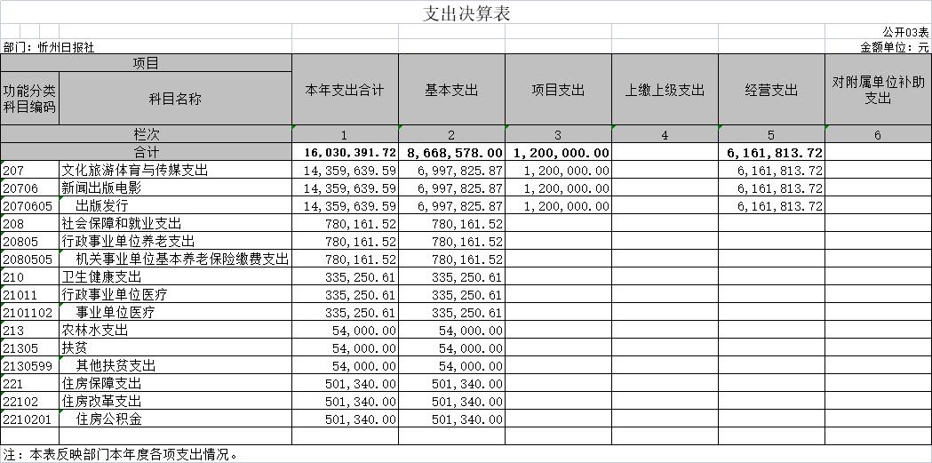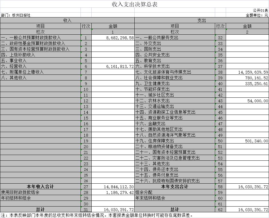 目錄 第一部分概況 一、本部門職責(zé) 二、機構(gòu)設(shè)置情況 第二部分2021年度部門決算報表 一、收入支出決算總表 二、收入決算表 三、支出決算表 四、財政撥款收入支出決算總表 五、一般公共預(yù)算財政撥款支出決算表(一) 六、一般公共預(yù)算財政撥款支出決算表(二) 七、一般公共預(yù)算財政撥款“三公”經(jīng)費支出決算表 八、政府性基金預(yù)算財政撥款收入支出決算表 九、國有資本經(jīng)營預(yù)算財政撥款支出決算表 十、部門決算公開相關(guān)信息統(tǒng)計表 第三部分2021年度部門決算情況說明 (將其中需要列示的事項--做成目錄) 第四部分名詞解釋 第五部分附件 第一部分概況 一、本部門職責(zé) (一)堅持正面宣傳報道為主,積極開展輿論監(jiān)1.主要職責(zé)職能 督。 (二)承辦市委、市政府和市委宣傳部交辦的其他事項。 (三)堅持政治家辦報的方針,把握正確的輿論導(dǎo)向,圍繞中心,服務(wù)大局,著力營造推進轉(zhuǎn)型跨越發(fā)展的輿論氛圍 (四)服從服務(wù)于市委、市政府中心工作,加強輿論宣傳和引導(dǎo),發(fā)揮主流媒體作用,為開放造勢,為發(fā)展鼓勁,為人民盡責(zé)。 (五)堅持從群眾中來,到群眾中去,圍繞“貼近實際、貼近群眾、貼近生活”,反映群眾的疾苦和呼聲,傾聽群眾的意見和建議,一切以為人民服務(wù)為出發(fā)點和落腳點。 二、機構(gòu)設(shè)置情況 我社下設(shè)十六個部室,分別為: (一)辦公室。負(fù)責(zé)單位日常運轉(zhuǎn)工作。負(fù)責(zé)文秘、文件管理、檔案管理、年度考核、資產(chǎn)考核、資產(chǎn)調(diào)配、車輛使用、安全保衛(wèi)、后勤服務(wù)等工作。負(fù)責(zé)黨群、干部人事、黨風(fēng)廉政、意識形態(tài)和綜合治理工作,負(fù)責(zé)離退休人員的服務(wù)工作。 (二)財務(wù)部。負(fù)責(zé)單位經(jīng)費計劃、財務(wù)開支和一切經(jīng)濟往來的結(jié)算、賬目處理、現(xiàn)金管理。負(fù)責(zé)繳納稅費、各類保險及住房公積金。 (三)策劃協(xié)調(diào)部。組織全媒體指揮中心會議,落實指揮中心指令。負(fù)責(zé)所有媒體平臺的數(shù)據(jù)信息、文字稿件、攝影圖片、視頻音頻的指揮處置,策劃重大選題報道。 (四)記者部。負(fù)責(zé)全市時政新聞及綜合報道工作。 (五)經(jīng)濟新聞部。負(fù)責(zé)全市工業(yè)、交通、財政、商務(wù)、城建、發(fā)改、經(jīng)濟開發(fā)區(qū)、金融等經(jīng)濟發(fā)展方面的采訪及報道工作。 (六)農(nóng)業(yè)農(nóng)村新聞部。負(fù)責(zé)全市農(nóng)業(yè)、農(nóng)村、農(nóng)民“三農(nóng)”、民政等方面的采訪報道工作。 (七)政教新聞部。負(fù)責(zé)全市政法、教育、群團、科技、衛(wèi)生、體育等方面的采訪報道工作。 (八)社會新聞部。負(fù)責(zé)全市新聞以及重大新聞、重大典型的采訪報道工作。 (九)影像部。負(fù)責(zé)全市重要會議、市領(lǐng)導(dǎo)重要活動的融媒體攝影、攝像報道工作。負(fù)責(zé)戰(zhàn)役性報道、重點報道、日常報道的圖片拍攝、攝像任務(wù)。 (十)新媒體生產(chǎn)部。負(fù)責(zé)新媒體產(chǎn)品的生產(chǎn)。負(fù)責(zé)《忻州日報》、《忻州日報·晚報版》等數(shù)字報的制作、上傳、發(fā)布工作。 (十一)正刊編輯部。負(fù)責(zé)《忻州日報》的編輯工作。負(fù)責(zé)戰(zhàn)役性報道、重點報道、圖片報道、圖片報道的組稿、編輯、配發(fā)《編者按》、《短評》等工作。 (十二)晚報編輯部。負(fù)責(zé)《忻州日報·晚報版》的編校工作。 (十三)副刊編輯部。負(fù)責(zé)文化、藝術(shù)、旅游等方面的采訪報道和稿件的編輯工作。 (十四)評論時訊部。負(fù)責(zé)本報社論、評論員文章及理論文章的撰寫工作。 (十五)統(tǒng)計考核部。負(fù)責(zé)單位各平臺產(chǎn)品的統(tǒng)計和全體人員量化考核、績效評比等工作。 (十六)技術(shù)運營部。負(fù)責(zé)保障報社各個系統(tǒng)的正常運行和大數(shù)據(jù)的管理維護。 第二部分2021年度部門決算報表 一、收入支出決算總表