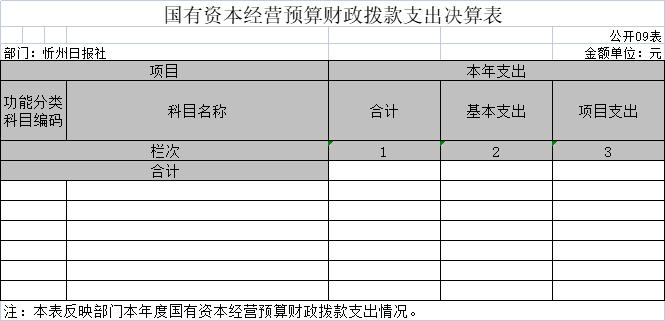 說明:忻州日報社沒有使用政府性基金預(yù)算安排的支出,故本表無數(shù)據(jù)。 九、國有資本經(jīng)營預(yù)算財政撥款支出決算表