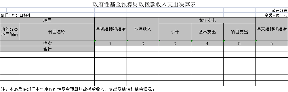 說明:忻州日報社沒有一般公共預(yù)算財政撥款“三公經(jīng)費”安排的支出,故本表無數(shù)據(jù)。 八、政府性基金預(yù)算財政撥款收入支出決算表