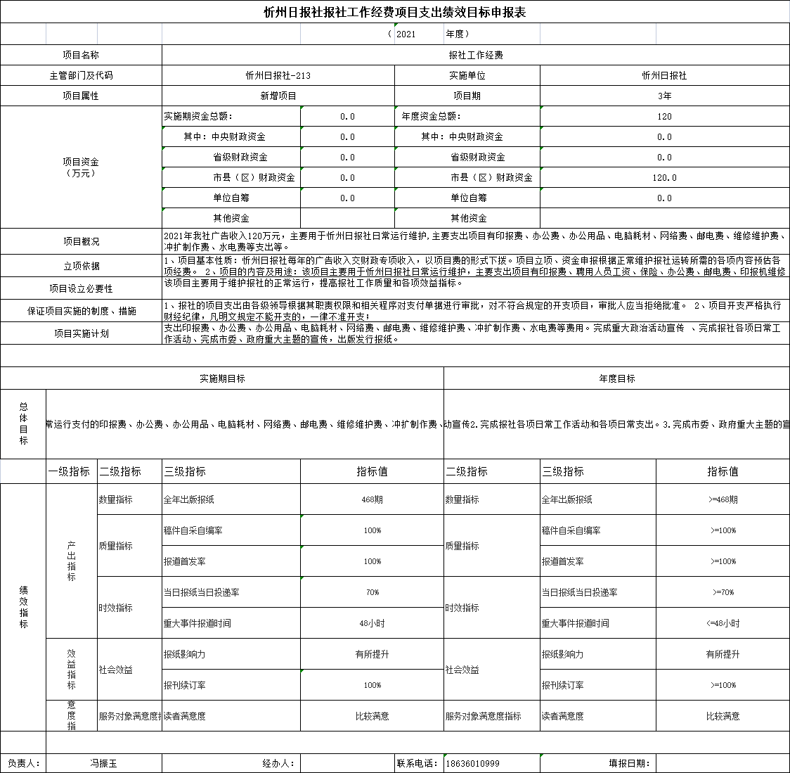 二、2021年忻州日報社報社工作經(jīng)費項目績效評價自評報告 一、項目概況 1、項目基本情況 一、基本情況 1、項目基本性質(zhì):忻州日報社每年的廣告收入交財政專項收入,以項目費的形式下?lián)埽?021年以忻州日報社工作經(jīng)費下?lián)芙o我單位120萬元。項目立項、資金申報根據(jù)正常維護報社運轉(zhuǎn)所需的各項內(nèi)容預(yù)估各項經(jīng)費。 2、項目的內(nèi)容及用途:該項目主要用于忻州日報社日常運行維護,主要支出項目有印報費、聘用人員工資、保險、辦公費、郵電費、印報機維修維護費、水電費等辦公費用的支出。 二、項目績效目標(biāo) 1、項目年度績效目標(biāo):維護報社的正常運行,完成辦公費、印刷費、水費、電費、郵電費、取暖費等各項支出。 2、項目應(yīng)實現(xiàn)的具體績效目標(biāo):維護報社的正常運行,提高報社工作質(zhì)量和各項效益指標(biāo)。 二、項目資金使用及管理情況 一、項目資金申報與批復(fù)情況 2021年項目資金申報120萬元,財政撥款資金批復(fù)120萬元。 二、資金計劃、到位及使用情況 資金計劃:2021年項目資金計劃120萬元,用于支付辦公費、印刷費、水費、電費、郵電費、取暖費等。 資金到位:項目資金到位120萬元,到位率100%,及時率100%。 三、資金管理情況 忻州日報社項目資金來源為財政撥款收入,按規(guī)定的程序和時間編制上報年度預(yù)算計劃,并嚴(yán)格執(zhí)行經(jīng)財政批準(zhǔn)的預(yù)算計劃,根據(jù)收入情況統(tǒng)籌安排各項支出。支付標(biāo)準(zhǔn)、支付進度、支付依據(jù)等合規(guī)合法,支付審批手續(xù)齊全,與預(yù)算相符。 三、項目組織實施情況 1、項目組織情況:按照合同撥款.按照預(yù)決算實施。 2、項目管理情況:在項目執(zhí)行過程中嚴(yán)格按照財務(wù)支出審批制度。 四、項目主要績效情況分析 1、目標(biāo)完成情況:2021年度已完成辦公費、印刷費、水費、電費、郵電費、取暖費等120萬元的費用支出。 目標(biāo)進度完成情況:項目實際完成進度按照預(yù)定計劃進度100%完成。 2、項目實施產(chǎn)生的效果:我社對項目實施所帶來的各類效益進行全面分析評價。 項目功能實現(xiàn)情況:經(jīng)濟效益收到良好效益、社會效益:能正確引導(dǎo)社會輿論導(dǎo)向、反映民聲民生欄目播出發(fā)揮了主流媒體作用環(huán)境效益、政治效益、運行保障效果、受益群體滿意度:服務(wù)對象滿意度100%。 五、主要經(jīng)驗及做法、存在問題和建議 主要經(jīng)驗及做法: 1、精打細(xì)算認(rèn)真做好項目預(yù)算。 2、資金管理上合理規(guī)范,加強各部門間溝通、協(xié)調(diào),確保資金安全。 3、嚴(yán)格按照項目進度結(jié)付款項。 4、確保質(zhì)量關(guān),使財政資金獲得較好的績效。 后續(xù)工作計劃: 報社今后將加強領(lǐng)導(dǎo),認(rèn)真檢查,嚴(yán)格落實責(zé)任制,在公用經(jīng)費使用上力求做到統(tǒng)籌兼顧、保證重點,量入為出,精打細(xì)算,將報社的長遠(yuǎn)規(guī)劃與短期安排相結(jié)合,努力提高經(jīng)費使用效益。 六、附件:無 三、2021年度忻州日報社部門整體支出預(yù)算績效自評報告 一、部門(單位)基本情況 1.主要職責(zé)職能 (一)堅持正面宣傳報道為主,積極開展輿論監(jiān)督。 (二)承辦市委、市政府和市委宣傳部交辦的其他事項。 (三)堅持政治家辦報的方針,把握正確的輿論導(dǎo)向,圍繞中心,服務(wù)大局,著力營造推進轉(zhuǎn)型跨越發(fā)展的輿論氛圍 (四)服從服務(wù)于市委、市政府中心工作,加強輿論宣傳和引導(dǎo),發(fā)揮主流媒體作用,為開放造勢,為發(fā)展鼓勁,為人民盡責(zé)。 (五)堅持從群眾中來,到群眾中去,圍繞“貼近實際、貼近群眾、貼近生活”,反映群眾的疾苦和呼聲,傾聽群眾的意見和建議,一切以為人民服務(wù)為出發(fā)點和落腳點。 2.組織架構(gòu) 我社下設(shè)十六個部室,分別為: (十七)辦公室。負(fù)責(zé)單位日常運轉(zhuǎn)工作。負(fù)責(zé)文秘、文件管理、檔案管理、年度考核、資產(chǎn)考核、資產(chǎn)調(diào)配、車輛使用、安全保衛(wèi)、后勤服務(wù)等工作。負(fù)責(zé)黨群、干部人事、黨風(fēng)廉政、意識形態(tài)和綜合治理工作,負(fù)責(zé)離退休人員的服務(wù)工作。 (十八)財務(wù)部。負(fù)責(zé)單位經(jīng)費計劃、財務(wù)開支和一切經(jīng)濟往來的結(jié)算、賬目處理、現(xiàn)金管理。負(fù)責(zé)繳納稅費、各類保險及住房公積金。 (十九)策劃協(xié)調(diào)部。組織全媒體指揮中心會議,落實指揮中心指令。負(fù)責(zé)所有媒體平臺的數(shù)據(jù)信息、文字稿件、攝影圖片、視頻音頻的指揮處置,策劃重大選題報道。 (二十)記者部。負(fù)責(zé)全市時政新聞及綜合報道工作。 (二十一)經(jīng)濟新聞部。負(fù)責(zé)全市工業(yè)、交通、財政、商務(wù)、城建、發(fā)改、經(jīng)濟開發(fā)區(qū)、金融等經(jīng)濟發(fā)展方面的采訪及報道工作。 (二十二)農(nóng)業(yè)農(nóng)村新聞部。負(fù)責(zé)全市農(nóng)業(yè)、農(nóng)村、農(nóng)民“三農(nóng)”、民政等方面的采訪報道工作。 (二十三)政教新聞部。負(fù)責(zé)全市政法、教育、群團、科技、衛(wèi)生、體育等方面的采訪報道工作。 (二十四)社會新聞