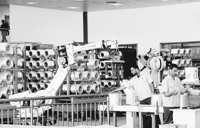 2015年,新蘇伊士運(yùn)河的開(kāi)通拉動(dòng)了埃及的制造業(yè)和基礎(chǔ)設(shè)施建設(shè)。圖為在北非最大的玻璃纖維制造企業(yè)埃及巨石公司,埃及員工與“機(jī)械手臂”一同生產(chǎn)的場(chǎng)景。王云松攝