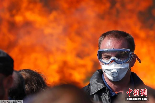 5月29日消息,近日,法國多個地區(qū)爆發(fā)示威,抗議勞工改革。防暴警察在巴黎和其他城市與抗議者對峙,77人被捕,15個警察受傷,汽車和商店遭到洗劫。圖為法國多杰斯的示威者設(shè)立燃燒路障,對勞工改革表示抗議。