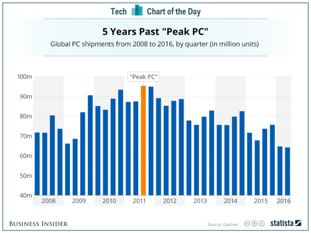 英特爾所有的改變源自日益萎縮的PC市場。美國投資銀行Bernstein分析師斯塔西雷斯根(Stacy Rasgon)表示,PC芯片是英特爾最大的營收來源,但其最終意識到,在PC行業(yè)不景氣的新常態(tài)下,必須尋找其他創(chuàng)收增長引擎。
