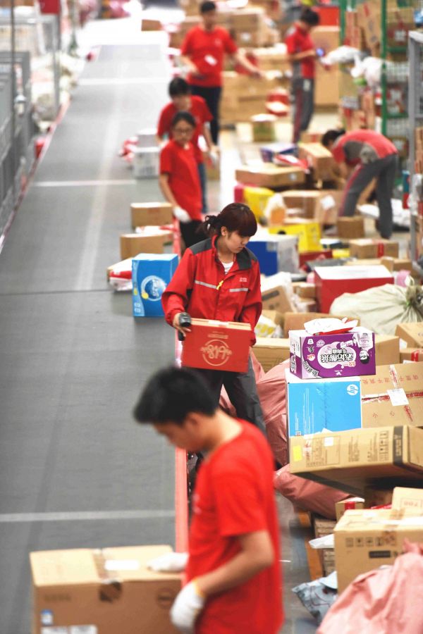 資料圖:6月14日,工作人員在物流中心的分揀中心忙碌,迎接中國網(wǎng)購“狂歡日”。 新華社記者陳曄華攝