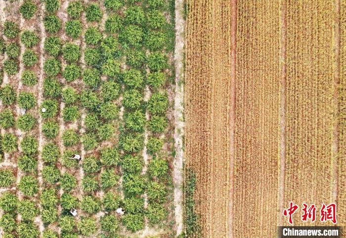山西省運城市新絳縣澤掌鎮(zhèn)喬溝頭村,幾名花農在田間采摘金銀花。(無人機照片)高新生 攝