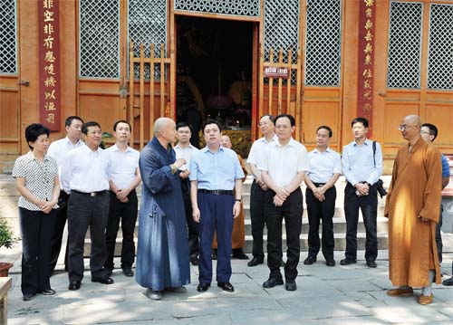中央統(tǒng)一戰(zhàn)線工作領(lǐng)導(dǎo)小組一行在五臺(tái)山顯通寺調(diào)研檢查宗教工作。劉紀(jì)森 攝