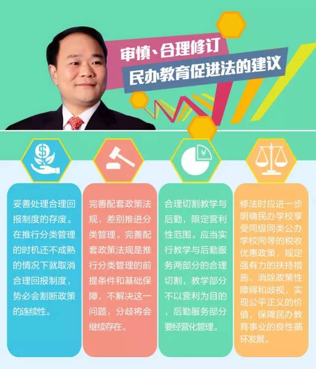 4、修法時應(yīng)進一步明確民辦學校享受同級同類公辦學校同等的稅收優(yōu)惠政策,規(guī)定強有力的扶持措施,消除政策性障礙和歧視,實現(xiàn)公平正義的價值,保障民辦教育事業(yè)的良性循環(huán)發(fā)展。