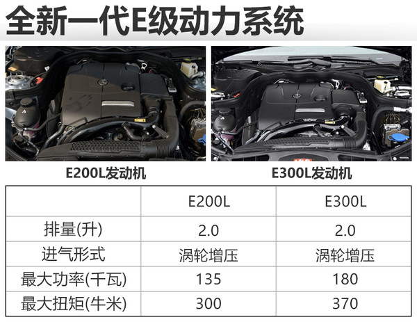 動力方面,新車將搭載兩款不同調(diào)校的2.0T渦輪增壓發(fā)動機,其中E200L是沿用現(xiàn)款車型上的2.0T發(fā)動機,最大功率135千瓦,最大扭計300牛米;E300L發(fā)動機則擁有更強的動力,最大功率180千瓦,最大扭矩達到370牛米。