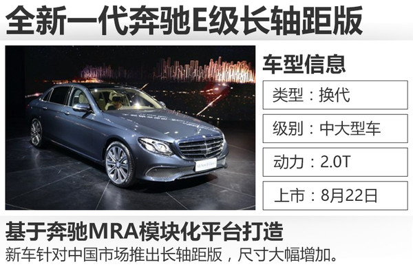 全新一代奔馳E級長軸距于上個月在北京奔馳亦莊工廠正式下線,新車針對中國市場的需求進行了全面優(yōu)化,從外觀、內(nèi)飾到車身尺寸都有明顯提升。網(wǎng)通社從梅賽德斯-奔馳官方了解到,全新一代奔馳E級長軸距版將于8月22日在北京正式上市。新車采用不同調(diào)校的2.0T發(fā)動機,并首次搭載9速自動變速箱。
