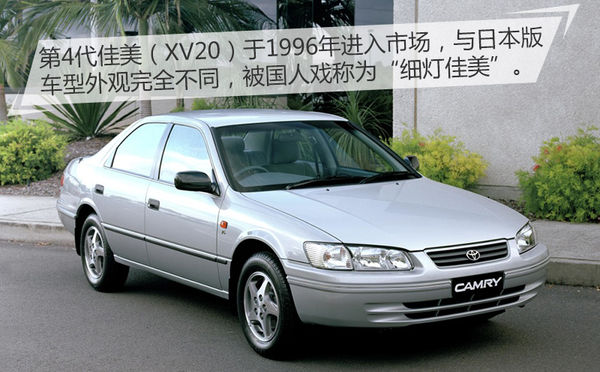 第4代佳美(XV20)于1996年進(jìn)入市場(chǎng),進(jìn)入國(guó)內(nèi)的仍是佳美海外版車型,在設(shè)計(jì)上與日本本土版采用了完全不同的理念。讓整車看上去更加修長(zhǎng)流暢,車頭和車尾都被設(shè)計(jì)得趨于扁平,由此帶來的是更細(xì)長(zhǎng)的頭燈和尾燈,所以XV20在國(guó)內(nèi)被人們戲稱為“細(xì)燈佳美”。